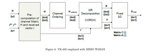 As an application, a single VK-402 is used to decode the different STC for the IEEE 802.16e WiMAX MIMO system by adaptively processing the received signal, according to the STC type, prior to feeding to the VK-402, Fig. 4.