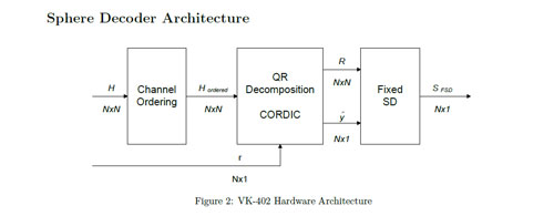 The VK-402 is FPGA prototyped for 4×4 MIMO system with 16-QAM modulation. Fig. 2 shows the architecture of the VK-402. The columns of the channel matrix H are assumed to be perfectly known at the receiver. They are first ordered according to number of lattice points considered at each level in the tree. Then, they are fed, along with the received vector, to the QR Decomposition block, which is based on CORDIC given rotation algorithm. The upper triangular matrix R and the rotated data vector y are both applied to the sphere decoder. The VK-402 is carefully and optimally designed to deliver a fixed throughput by using semi-parallel architecture for processing the tree nodes. Based on this implementation,the VK-402 provides an improved hardware implementation in terms of throughput and area, which compares favorably to other implementations.